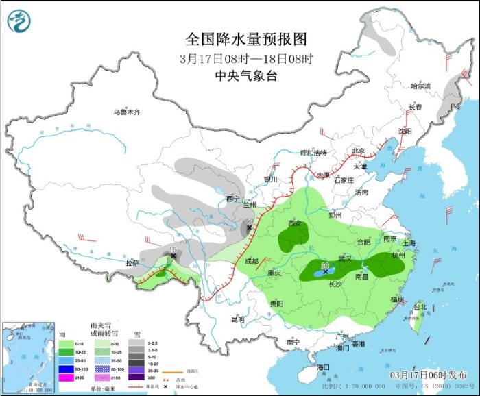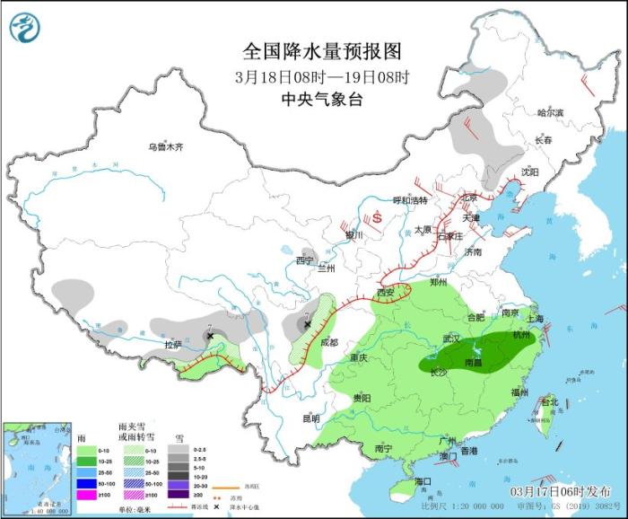 3月17日08时至18日08时,西藏东部、青海东北部和南部、甘肃南部、川西高原北部、内蒙古东北部、黑龙江东部、吉林东部等地部分地区有小到中雪或雨夹雪,其中,西藏东部、川西高原北部等地局部地区有大到暴雪(10~15毫米)。西藏东南部、西北地区东部、西南地区东部、黄淮西部、江淮中西部、江汉、江南、华南北部等地部分地区有小到中雨,其中,湖南北部等地部分地区有大雨(25~30毫米)。内蒙古中西部、黑龙江东部、辽宁中北部、辽东半岛、山东半岛、江苏中部、四川盆地中部等地部分地区有4~6级风。