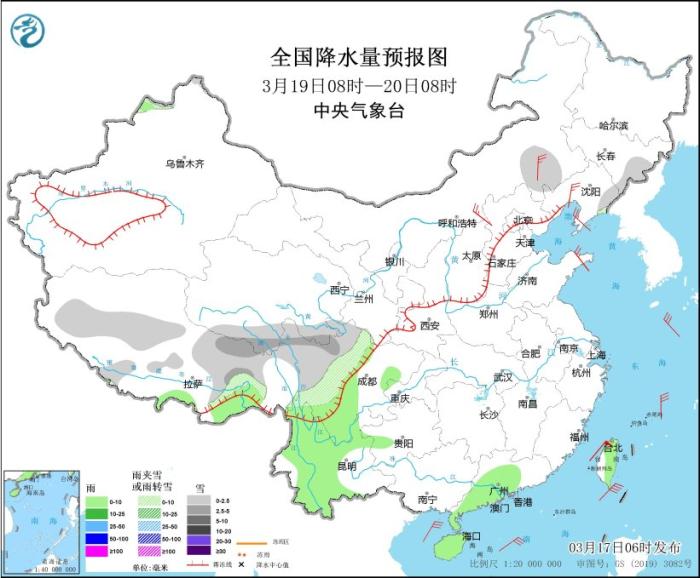 3月19日08时至20日08时,内蒙古东南部、吉林东部、西藏北部、青海南部、西南地区北部等地部分地区有小雪或雨夹雪,其中,西藏东部和北部、青海南部、川西高原北部等地部分地区有中雪。西藏东南部、四川盆地西南部、四川南部、云南大部、广东西南部和中部、海南岛、台湾岛大部等地部分地区有小雨。内蒙古东南部和中部、辽宁南部和西部、山东半岛等地部分地区有4~5级风。