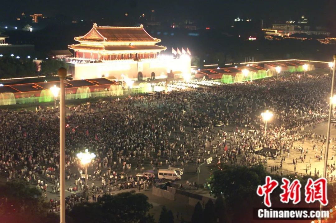 2001年7月13日晚,北京天安门广场人潮涌动,数以十万计的民众彻夜不眠庆祝北京申奥成功。毛建军 摄