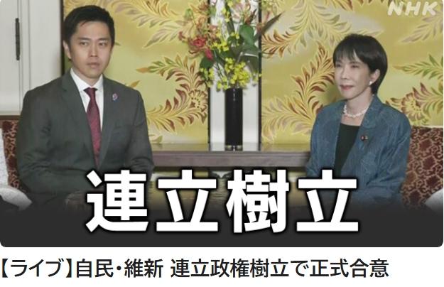 中新网10月20日电 据日本广播协会(NHK)报道,当地时间20日,日本自民党总裁高市早苗与日本维新会代表吉村洋文举行两党党首会谈,双方签署了关于两党联合执政的协议文件,正式确立联合执政。