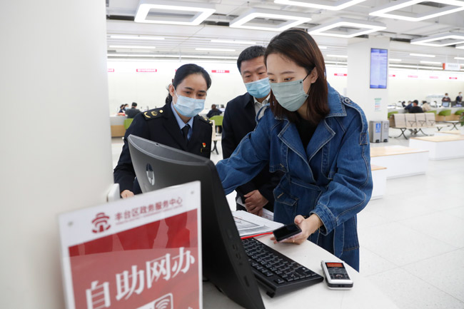 刘鹏琨女士在工作人员的指导下办理相关手续。渠忠涛摄