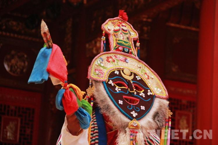 图为拉萨市城关区娘热民间艺术团演员多吉次仁表演国家级非物质文化遗产“嘎尔”摄影:刘莉