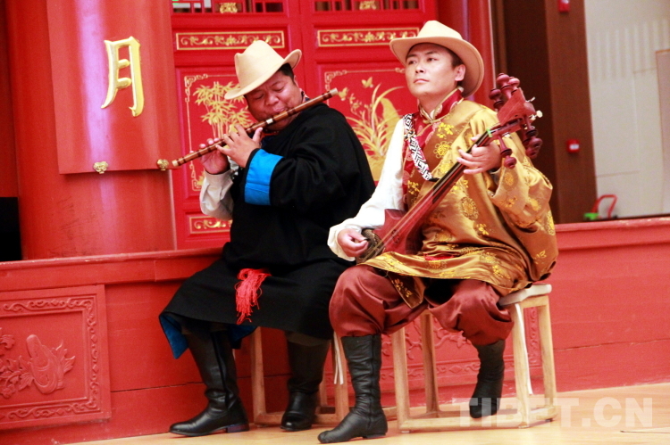 图为拉萨市城关区娘热民间艺术团乐师米玛(左)和拉巴次仁(右)为演出伴奏。米玛是西藏自治区级嘎尔传承人,担任艺术团笛子演奏、司鼓;拉巴次仁是拉萨市城关区级喇嘛玛尼传承人,担任艺术团扎木年演奏。摄影:刘莉