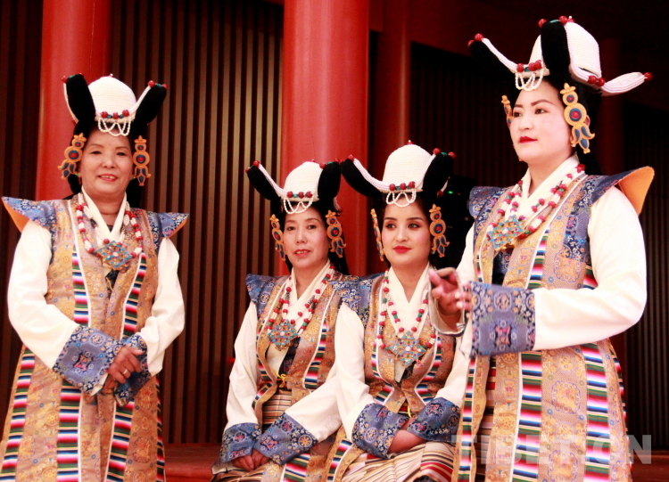 图为拉萨市城关区娘热民间艺术团演员央宗(左一)、德吉卓嘎(左二,拉萨市级觉木隆藏戏传承人)、洛桑卓玛(左三)和强珍正在候场 摄影:刘莉