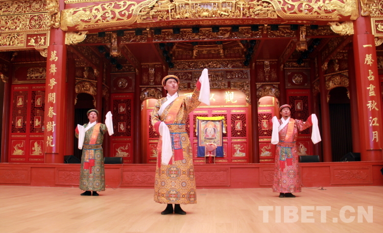 拉萨市城关区娘热民间艺术团在藏戏这一非物质文化遗产瑰宝的传承中硕果累累,拥有西藏自治区级、拉萨市级和拉萨市城关区级多位非遗传承人,是西藏自治区100多个民间剧团中唯一一个能够完整表演“八大藏戏”的团体。图为拉萨市城关区娘热民间艺术团表演的藏戏开场《温巴顿》片段 摄影:刘莉