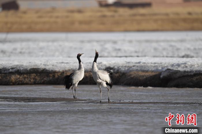 图为一对成体黑颈鹤在党河湿地嬉戏。(资料图) 受访者供图