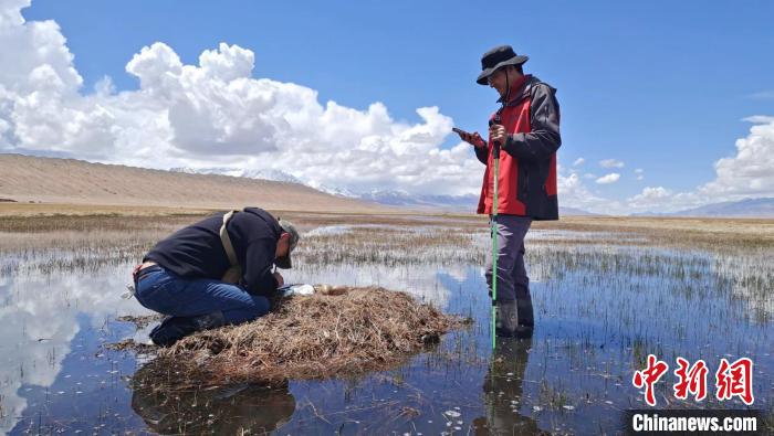 图为杨巨才(右)在甘肃酒泉市肃北县党河湿地开展黑颈鹤巢位监测工作。(资料图) 受访者供图