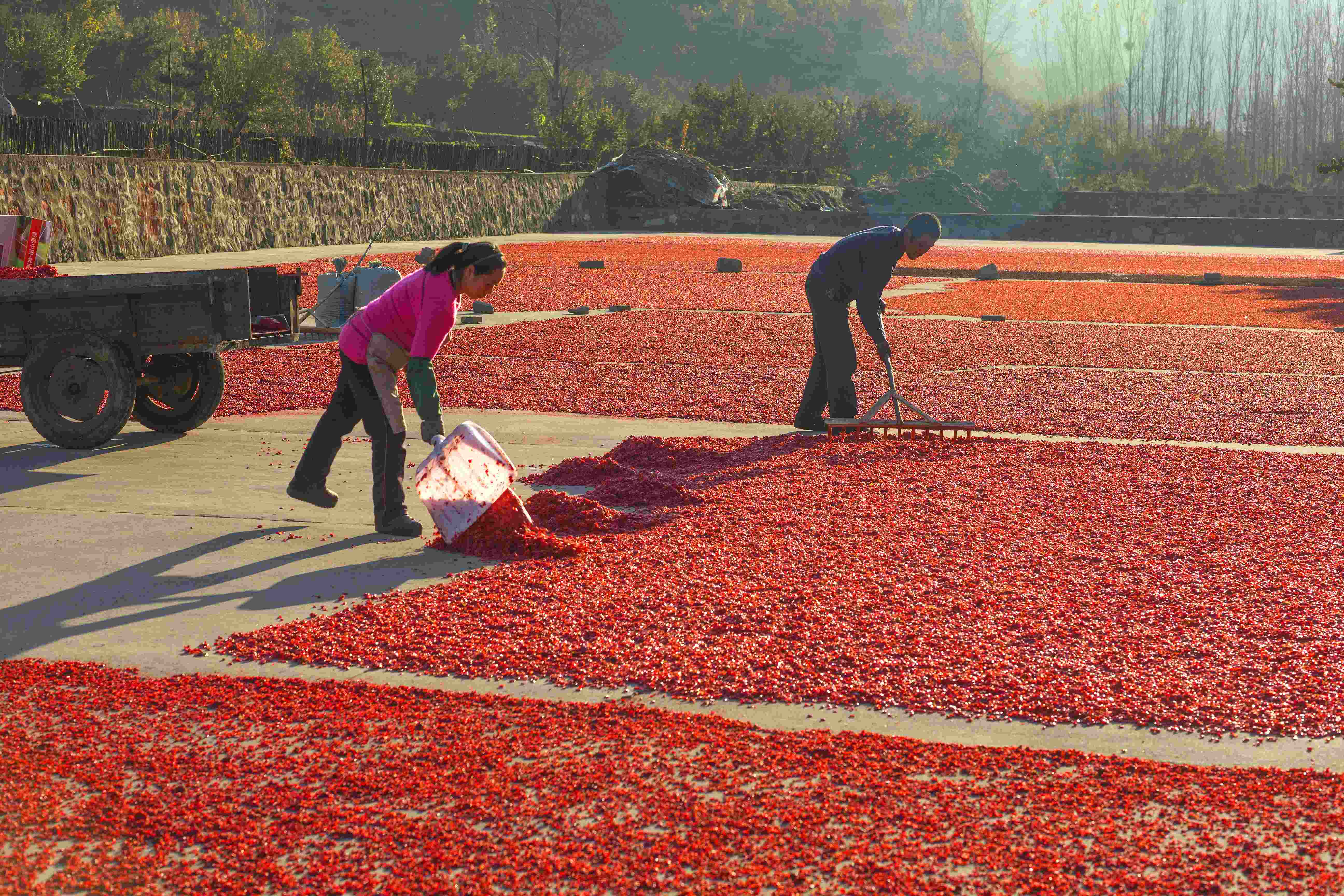 村民们在晾晒山茱萸。