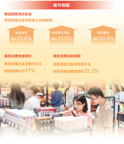 数据显示,春节假期商品销售亮点纷呈。春节假期,节庆商品、国货潮品、绿色智能产品等持续旺销。商务部重点监测零售企业金银珠宝、体育娱乐用品、通信器材销售额同比分别增长23.8%、15.6%和10.4%。