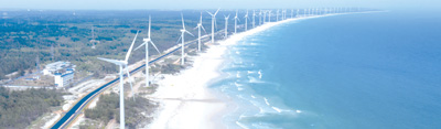 为满足海南自贸港高质量发展电力需求,有效推进大规模新能源电力消纳,海南500千伏主网架工程正在抓紧建设。图为海南省文昌市木兰湾沿海的风力发电机。