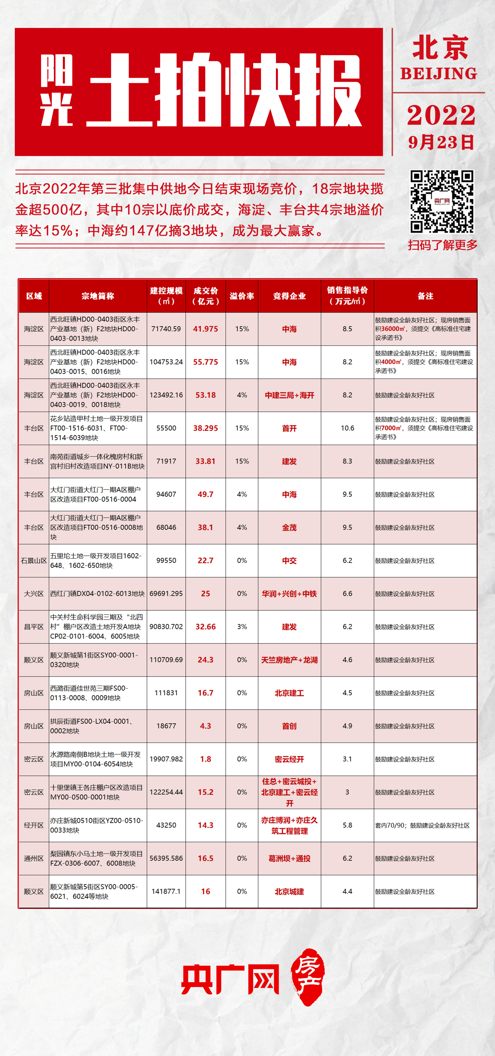 其中10宗地以底价成交,8宗进入现场竞拍环节,海淀、丰台两区共4宗地达到土地上限价,溢价率15%。中海以147.45亿夺得海淀永丰、丰台大红门3宗热门地块,成为此次拿地金额最高、数量最多的企业。