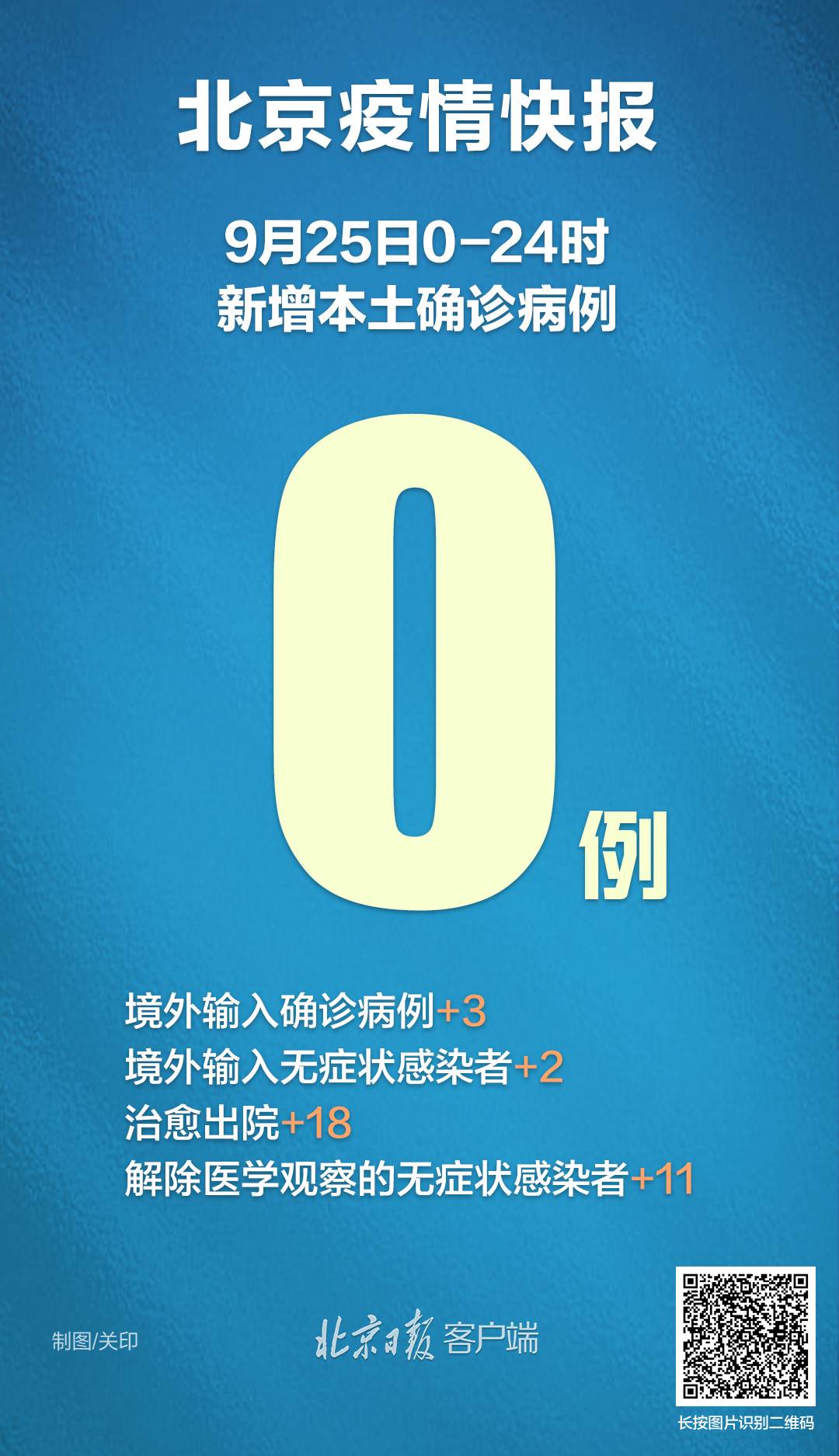 9月25日0时至24时,北京无新增本土确诊病例、疑似病例和无症状感染者;新增3例境外输入确诊病例和2例无症状感染者,无新增疑似病例。治愈出院18例,解除医学观察的无症状感染者11例。