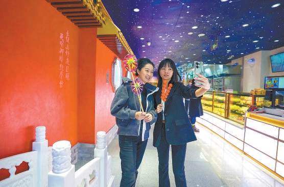 在位于朝外附近的北京稻香村零号店新店内,顾客在充满古都元素的红墙金瓦前打卡留影。 本报记者 武亦彬摄