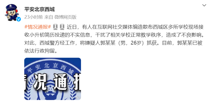 央广网北京4月3日消息 据北京市公安局西城分局官方微博平安北京西城消息,近日,有人在互联网社交媒体编造散布西城区多所学校现场接收小升初简历投递的不实信息,干扰了相关学校正常教学秩序,造成了不良影响。