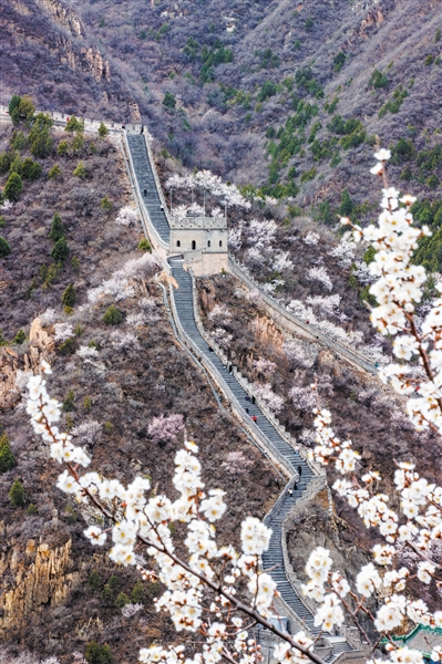 3月24日,居庸关长城与山花烂漫同框。新京报记者 王子诚 摄
