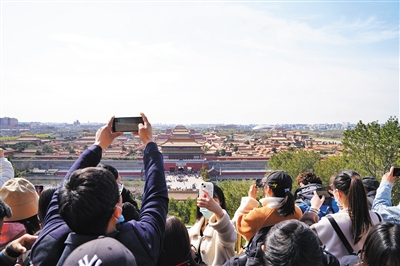 3月26日,景山公园,游客眺望远处故宫拍照打卡。新京报记者 王飞 摄