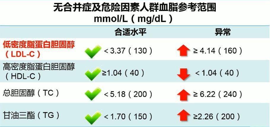 总胆固醇是指血液中胆固醇的总含量,该指标升高则表示容易形成动脉粥样硬化斑块,导致心脑血管疾病。高密度脂蛋白胆固醇,能将沉积在血管中的胆固醇运回肝脏,变成胆汁随粪便排出体外,可以降低患心脏病等心血管疾病的风险,因而也被称为血管的“清道夫”,数值越高越好。低密度脂蛋白胆固醇,被认为是动脉粥样硬化发生和发展的“罪魁祸首”,它负责将肝脏中的胆固醇转运到身体的各个组织细胞,但却不负责将送出的胆固醇收回,这个指标越高,发生心脑血管疾病的风险就越大。甘油三酯是人体脂肪的组成部分,可以为人体储存和供给能量。甘油三酯升高,往往与饮食有关,甘油三酯指标升高严重时会诱发急性胰腺炎。