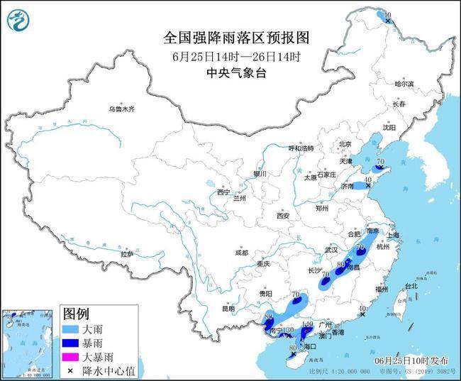 中央气象台6月25日10时继续发布暴雨黄色预警:
