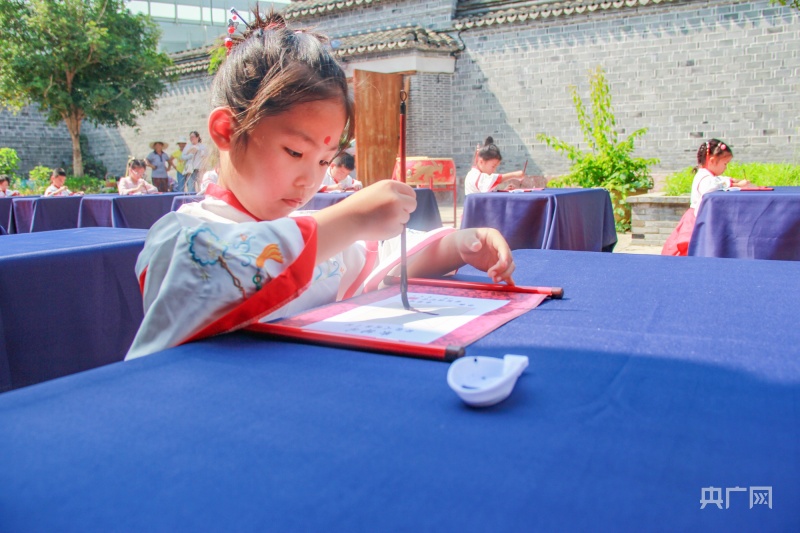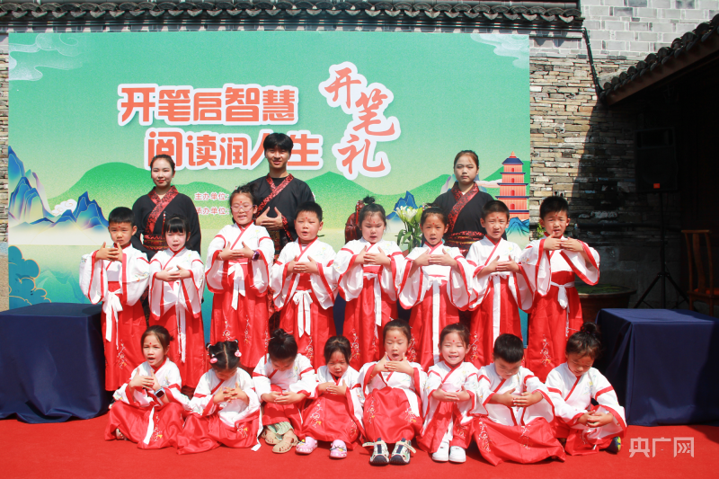 央广网宁波8月22日消息(记者 张雯雯 通讯员 方舟 安雨晨)树影婆娑,古韵悠扬,鼓声清越,翰墨飘香。8月22日,在新学年来临之际,宁波市江北区庄桥街道马径村文化礼堂举行了一场别开生面的“开笔启智慧 阅读润人生”开笔礼。活动在茂昌房举行,20多名即将上小学的小朋友身着汉服,在开笔仪式中感受中国传统文化的魅力。