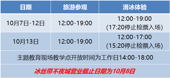 10月7日至10月12日,旅游参观和滑冰体验开放时间为12:00-19:00,滑冰体验停止检票入场时间为17:20。