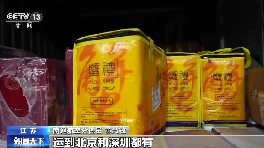 南通航空分拣员 黄慧敏:这批是来的镇江郭庄来的大闸蟹,已经开始分拣了,运到北京和深圳都有。