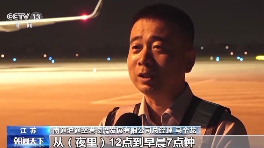 南通沪通空港物流发展有限公司总经理 马金龙:从夜里12点到早晨7点钟,陆续有8个航班离港,目的站主要是广州、深圳、北京几个机场。