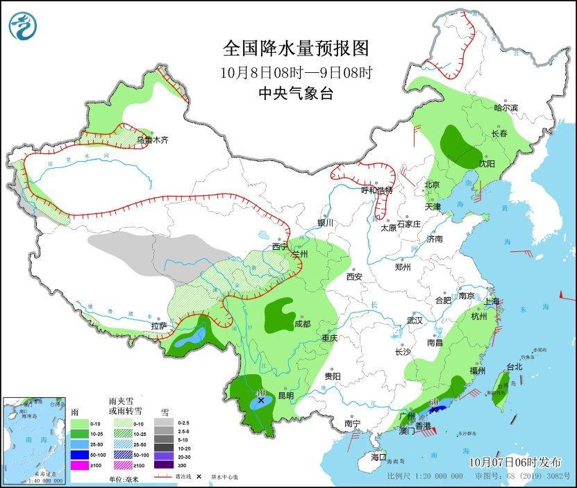 图1 全国降水量预报图(10月7日08时-8日08时)