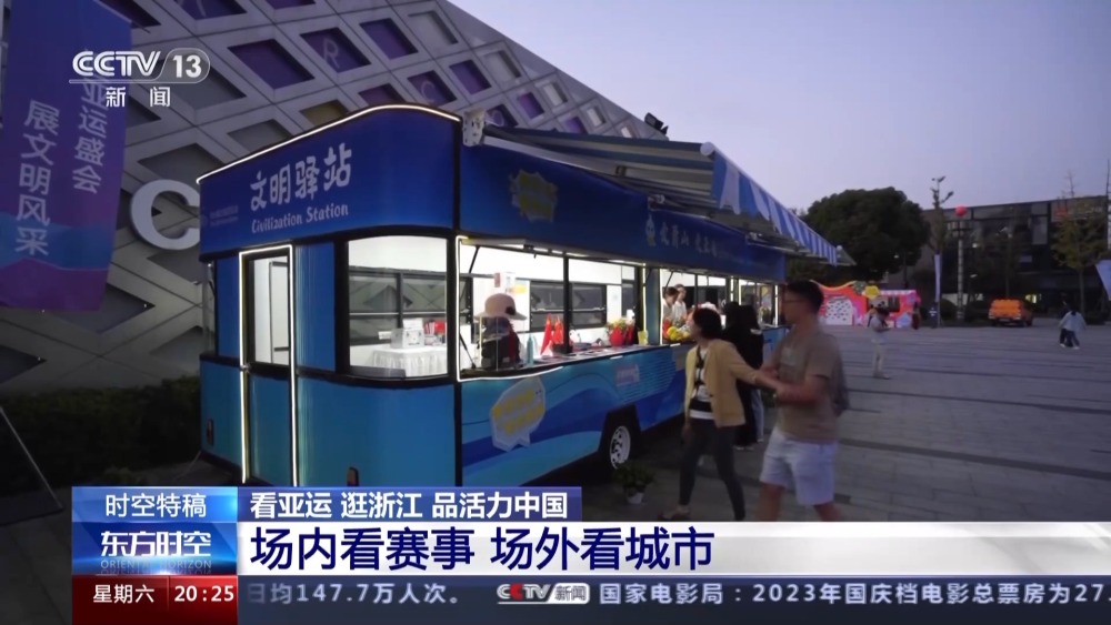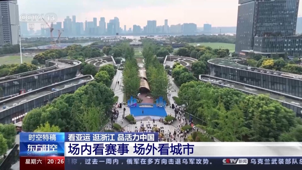 总台记者 孙锐:这里是杭州市萧山区的钱江世纪公园,每到傍晚这里就会格外热闹,大家围着亚运观赛空间看比赛,或到附近的亚洲花卉主题展园赏花;又或者到钱塘江边的绿道上吹吹江风,感受秋意。