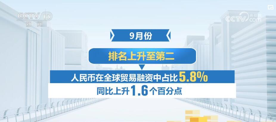 伴随着中国金融业对外开放持续深化,人民币国际化水平持续提升。从贸易看,今年1—9月,货物贸易中人民币结算的占比达到了24.4%,同比上升7个百分点,为近年来最高水平。与此同时,人民币融资货币功能稳步提升。9月份,人民币在全球贸易融资中占比为5.8%,同比上升1.6个百分点,排名上升至第二。目前,全世界有80多个国家和经济体将人民币纳入储备货币。