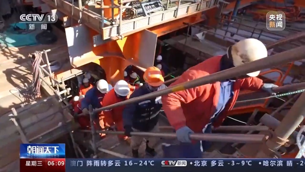 总台央视记者 张丛婧:可以看到能源碗里的空间非常狭窄,因为这些模块由几十万个零部件组成,集成度很高,我们现在进一个施工现场里看一下。工人师傅们正在这里铺设电缆,他们都是要蹲着,像这样挪动才能够完成这些操作。我发现其实像这样的高难度施工,几乎涉及所有的工种。
