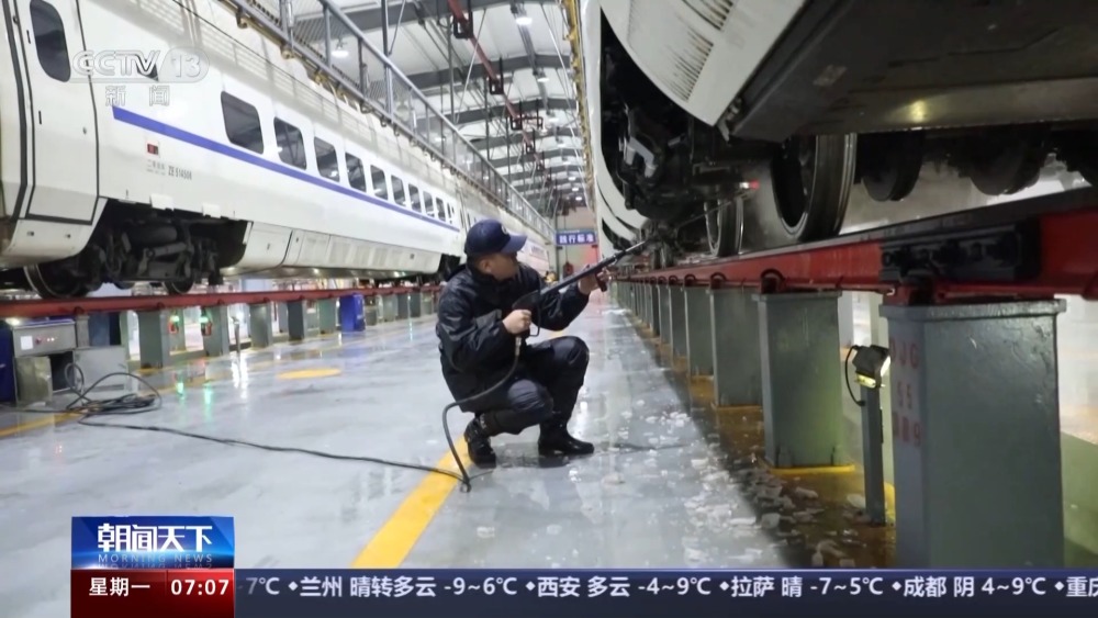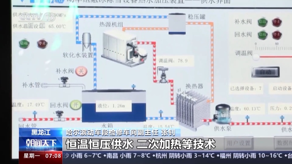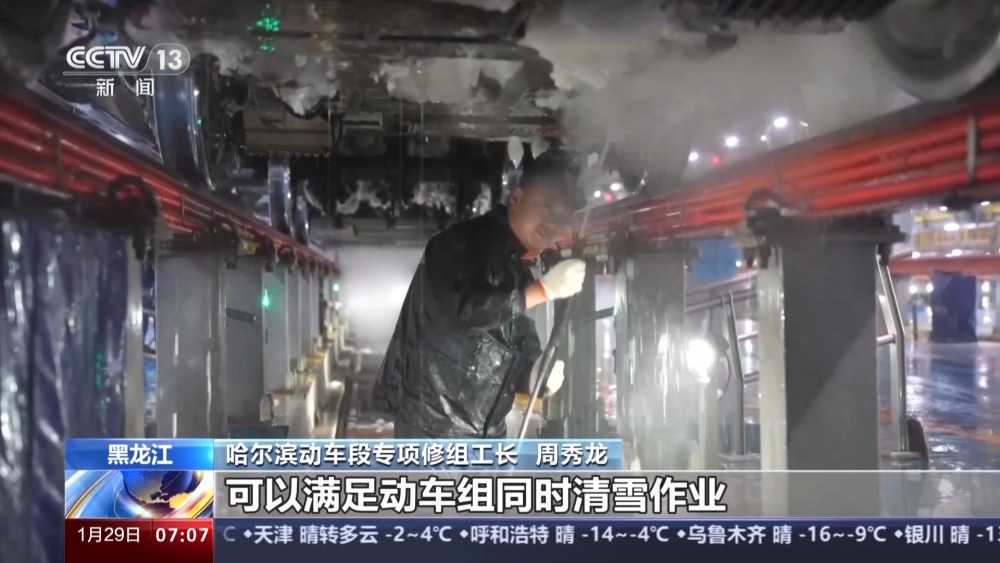 哈尔滨动车段检修车间副主任 张钊:设备的迭代主要体现在集中适时加热、恒温恒压供水、二次加热等技术,能够满足整列动车组清冰除雪需求。