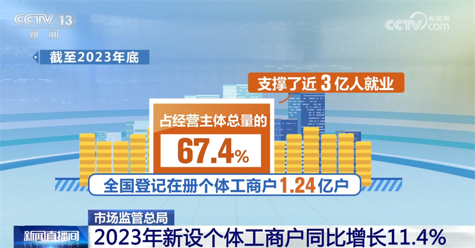 截至2023年底,全国登记在册个体工商户1.24亿户,占经营主体总量的67.4%,支撑了近3亿人就业;全年新设个体工商户2258.2万户,同比增长11.4%。