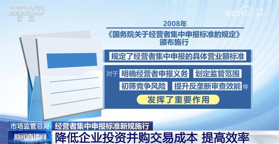 市场监管总局介绍,经营者集中申报标准是经营者集中反垄断审查制度的重要内容。2008年《国务院关于经营者集中申报标准的规定》颁布施行,规定了经营者集中申报的具体营业额标准,对于明确经营者申报义务、划定监管范围、初筛竞争风险、提升反垄断审查效能等发挥了重要作用。