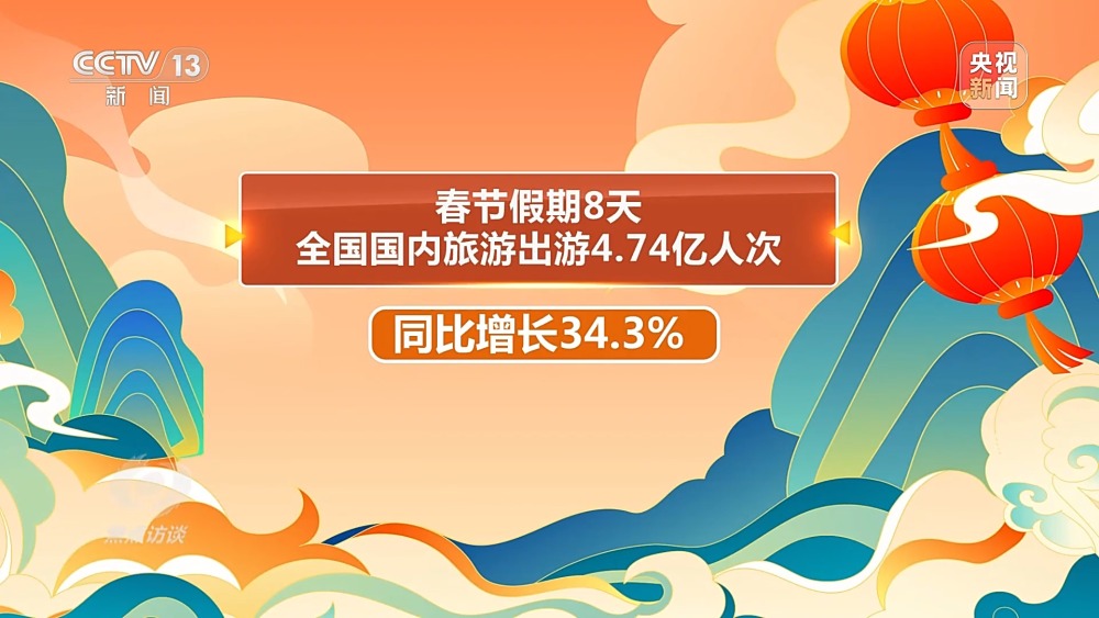 春节假期,全国上下洋溢着喜气洋洋、红红火火的节日气氛。农历正月初一至初八,电影总票房突破80亿元,创中国影史春节档票房纪录;春节假期8天全国国内旅游出游4.74亿人次,同比增长34.3%;腊月二十三以来,全国重点商圈的客流总量同比增长超70%;春节前后,超500万条打卡传统文化的内容在社交平台上掀起热潮。