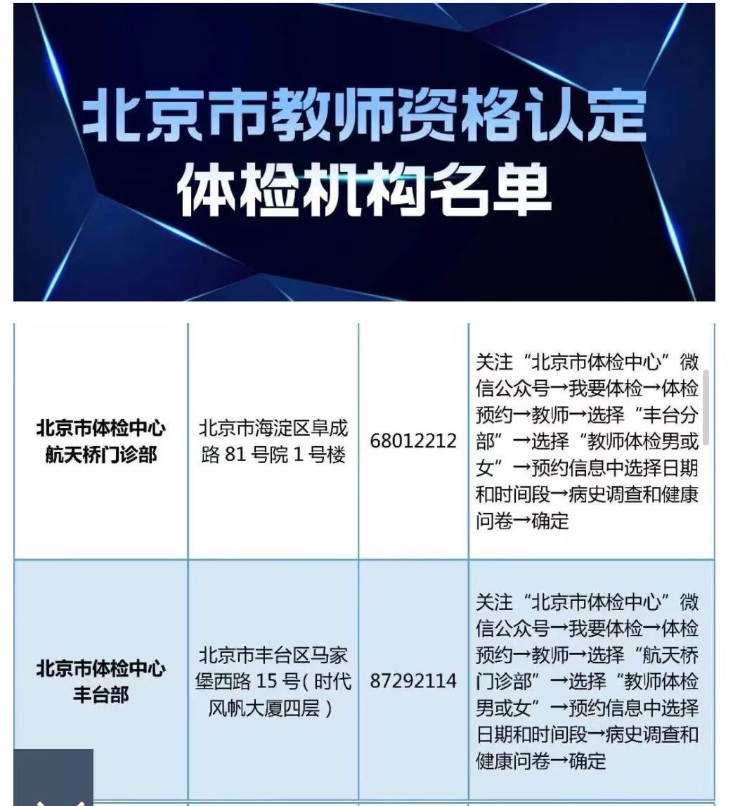 尚未进行体检的请自行与体检机构联系完成体检。北京市体检中心将于3月中下旬在丰台部、航天桥门诊部和马甸部举行多场教师资格认定体检专场。具体时间安排可联系相应机构咨询。