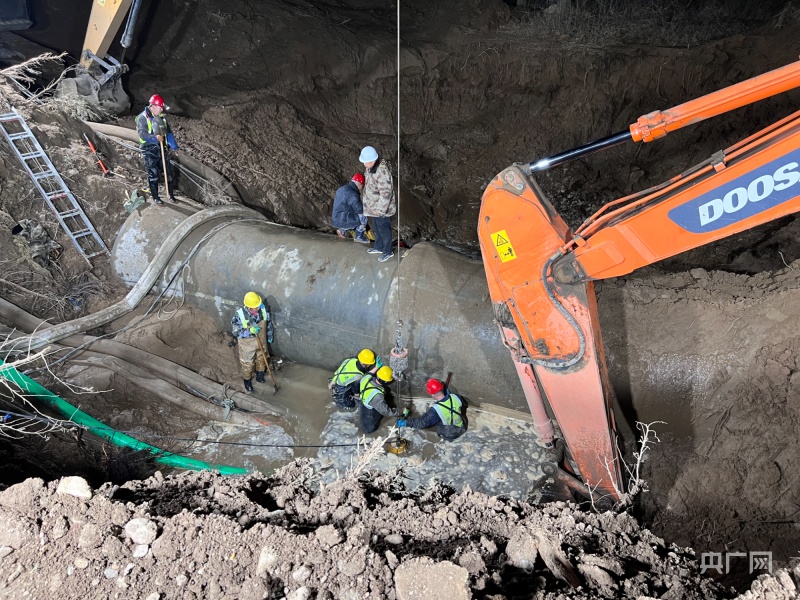 张文伟说:“因为这个管道是个两米直径的供水管线,是个主管线,它破裂以后水量特别大。管线是在耕地上,维修车辆是进不去的。维修首先得修筑施工通道,所有车辆人员靠近不了,然后关闸停水,走施工通道过去以后,进行原有管道抽排,管道里都是满水,必须把水排干净才能抢修,才能发现它是哪儿坏了,我们采取哪种方式来进行抢修。抢修方案有很多种,我们也提前都有预案。所以抽水时间很长,上游就有7万多立方的水,抽排就是一个很大的难点。”