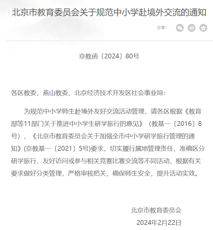 央广网北京3月11日消息(记者冯仪)近日,北京市教委发布关于规范中小学赴境外交流的通知,通知中提到,请各区根据《教育部等11部门关于推进中小学生研学旅行的意见》(教基一〔2016〕8号)、《北京市教育委员会关于加强全市中小学研学旅行管理的通知》(京教基一〔2021〕5号)要求,切实履行属地管理责任,准确区分研学旅行、友好访问或参与相关竞赛比赛交流等不同活动,根据有关要求做好分类管理,严格审核把关,确保师生安全,提升活动实效。