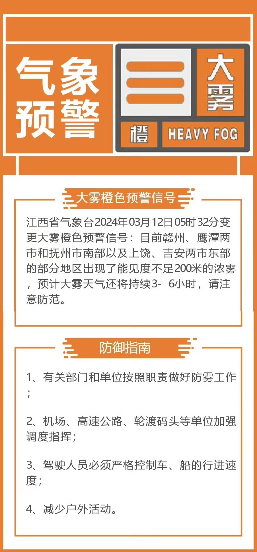 江西省气象台2024年3月12日5时32分变更大雾橙色预警信号:目前赣州、鹰潭两市和抚州市南部以及上饶、吉安两市东部的部分地区出现了能见度不足200米的浓雾,预计大雾天气还将持续3~6小时,请注意防范。