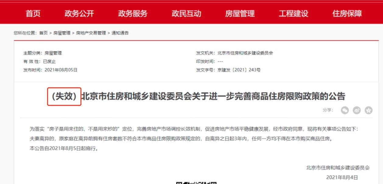 2021年8月4日,北京市住建委发文规定,夫妻离异的,原家庭在离异前拥有住房套数不符合本市商品住房限购政策规定的,自离异之日起3年内,任何一方均不得在本市购买商品住房。