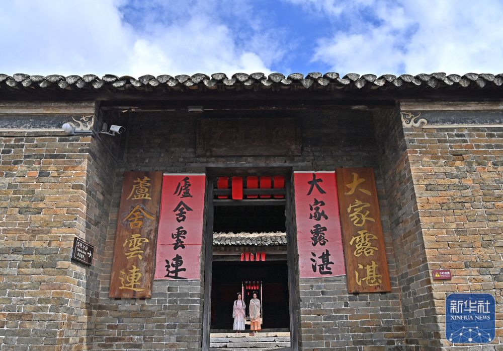 8月16日,一名身着汉服的游客在大芦村古建筑群里跳舞(无人机照片)。