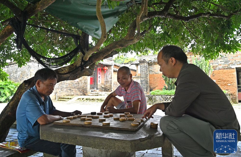 8月16日,几名村民在大芦村古宅前的树下下棋。