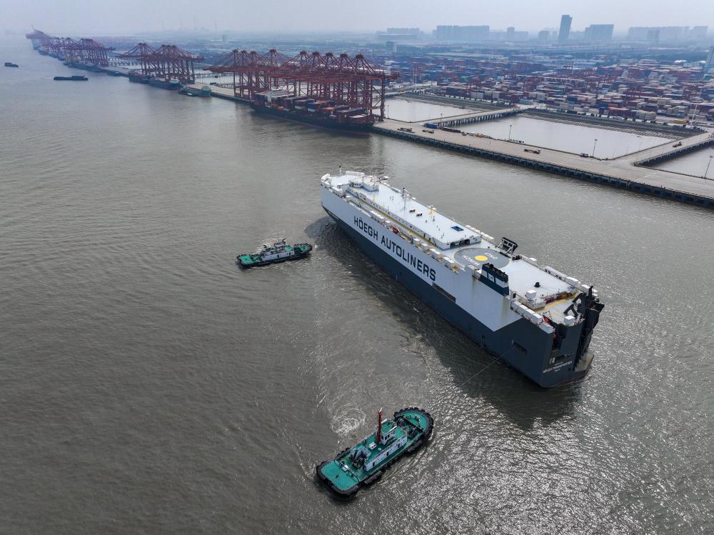 一艘货轮驶离江苏省苏州港太仓港区集装箱码头(无人机照片,10月10日摄)。新华社记者 李博 摄