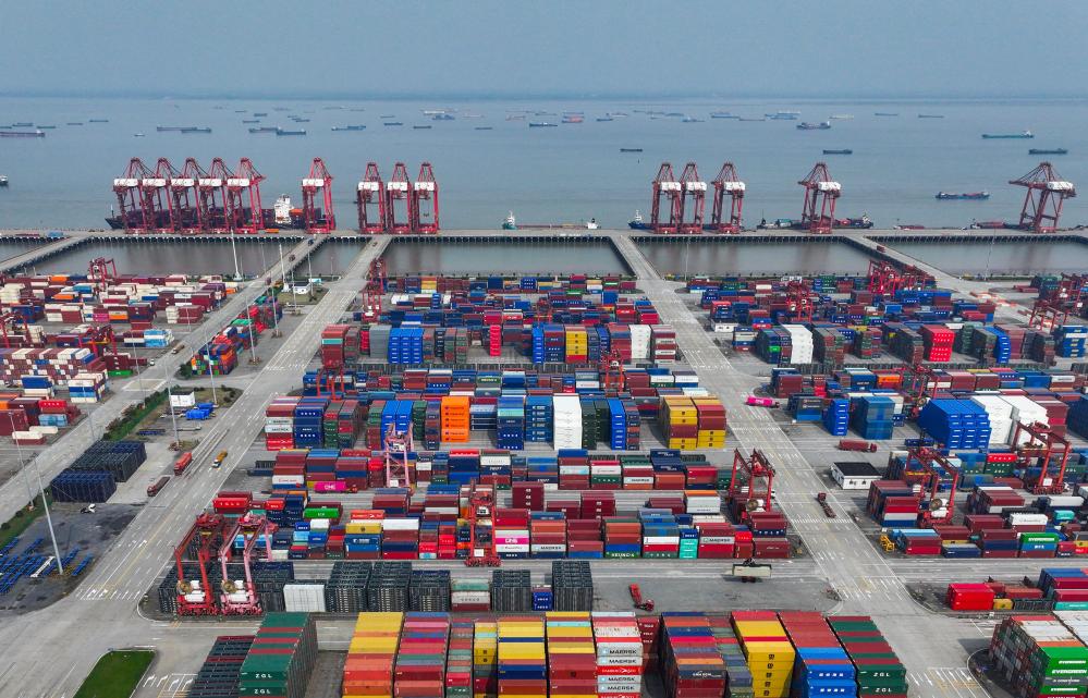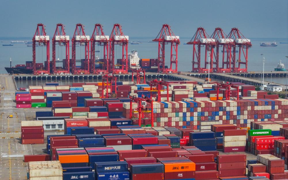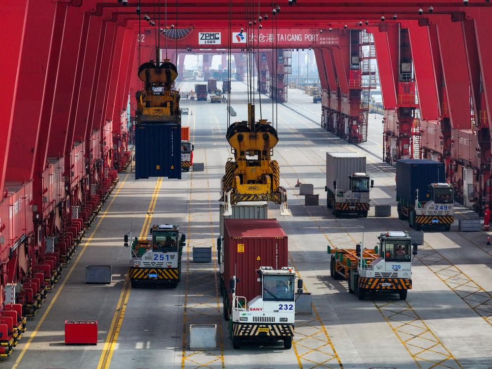 江苏省苏州港太仓港区集装箱码头,集装箱吞吐作业繁忙(无人机照片,10月10日摄)。新华社记者 李博 摄