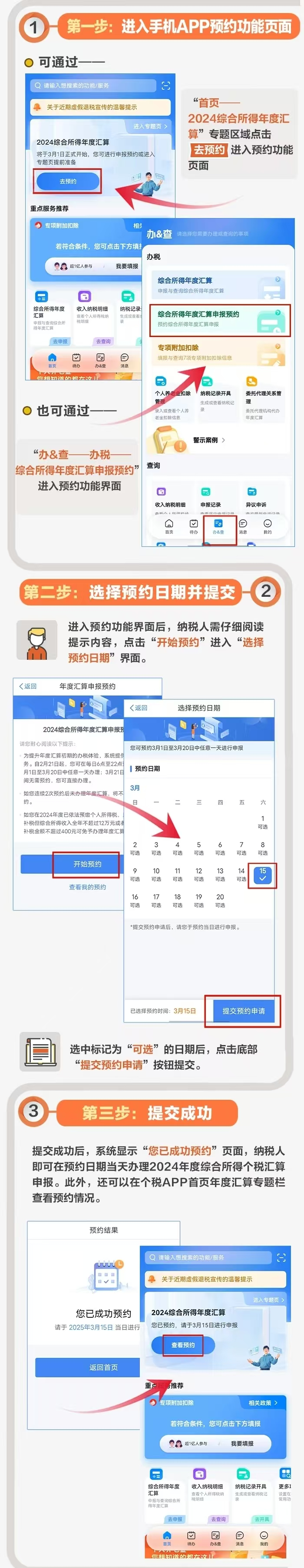 如需在3月1日至3月20日之间办理年度汇算,可在2月21日至3月20日每天6时至22时登录手机个人所得税APP进行预约。