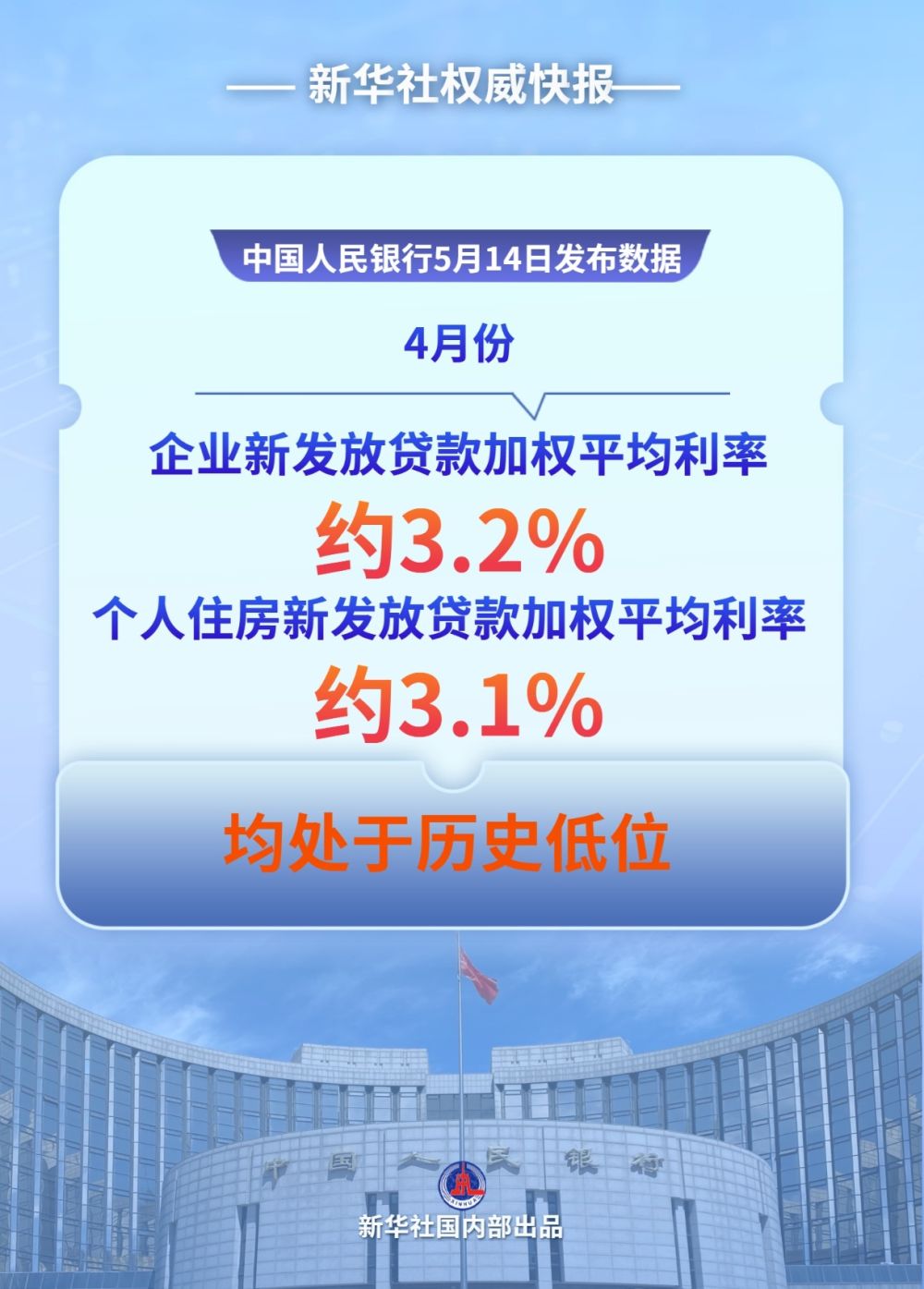 中国人民银行的数据显示,4月份,企业新发放贷款加权平均利率约3.2%,比上年同期低约50个基点;个人住房新发放贷款加权平均利率约3.1%,比上年同期低约55个基点,均处于历史低位。