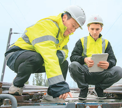 在塞尔维亚诺维萨德的匈塞铁路塞尔维亚段项目部营地,中国员工段伟(左)与外籍员工一起检查轨道施工情况。