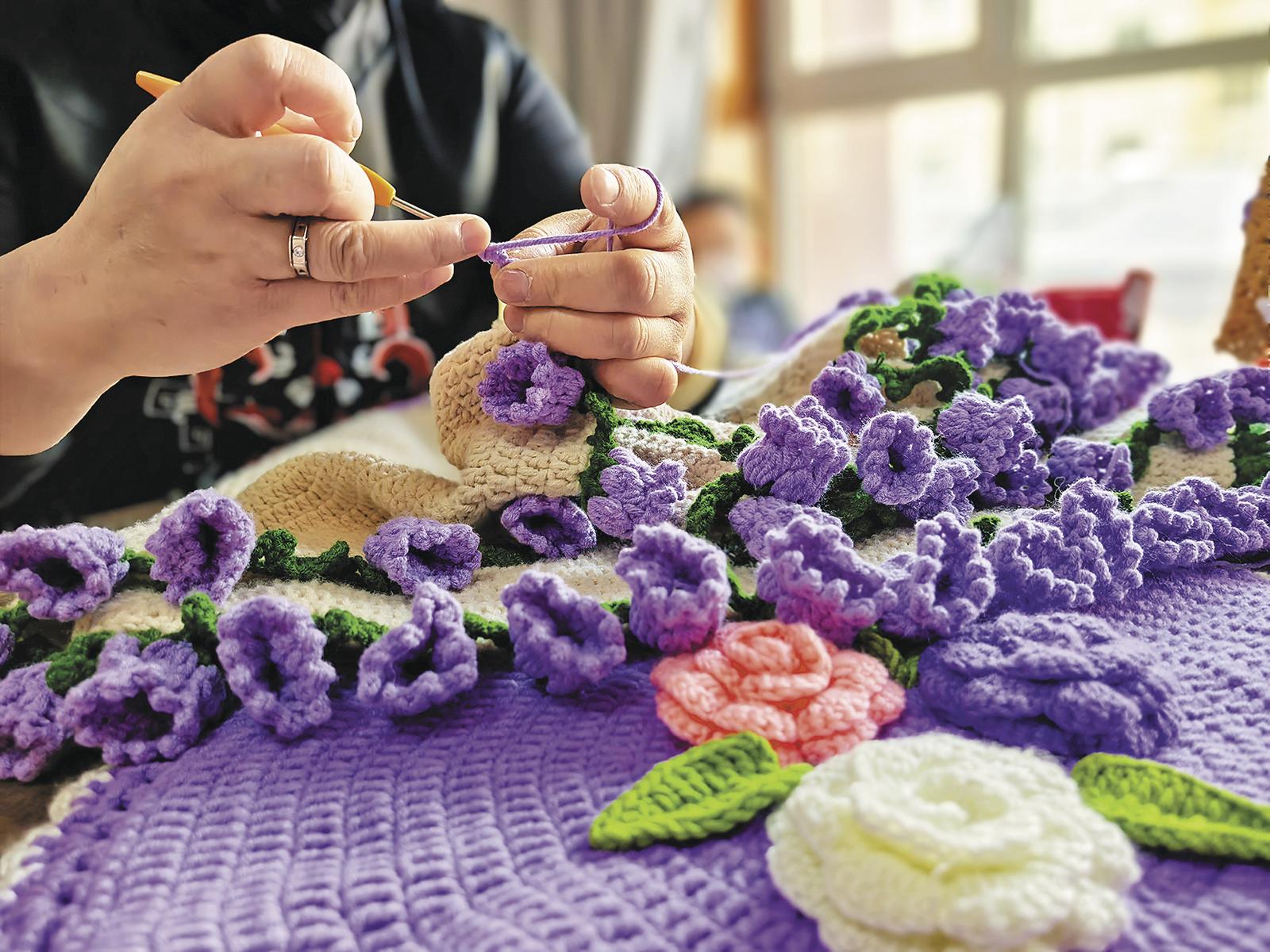 找到了目标就马上行动,盖毯、杯垫、发箍,玫瑰花、郁金香、铃兰花……各种花型的各类产品经过她的一双巧手被“创造”出来,成为工作室里最吸睛的“装饰”,也吸引不少群众前来“拜师学艺”。