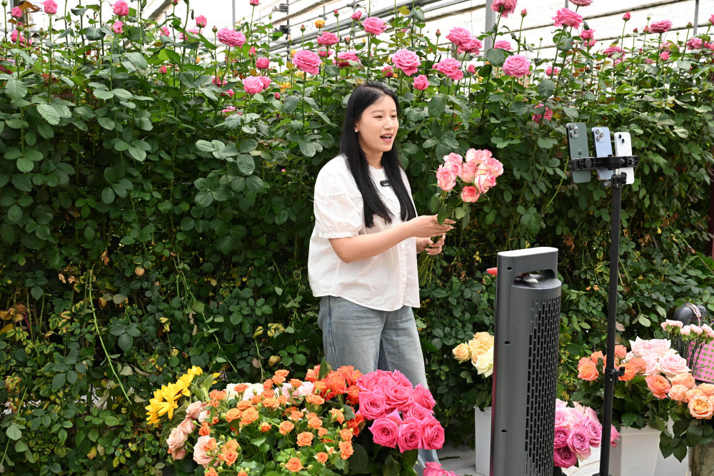 5月24日,在莒县招贤镇曲坊现代农业产业园的玫瑰基地,工作人员通过网络直播销售鲜切玫瑰花。新华社记者 马宁 摄