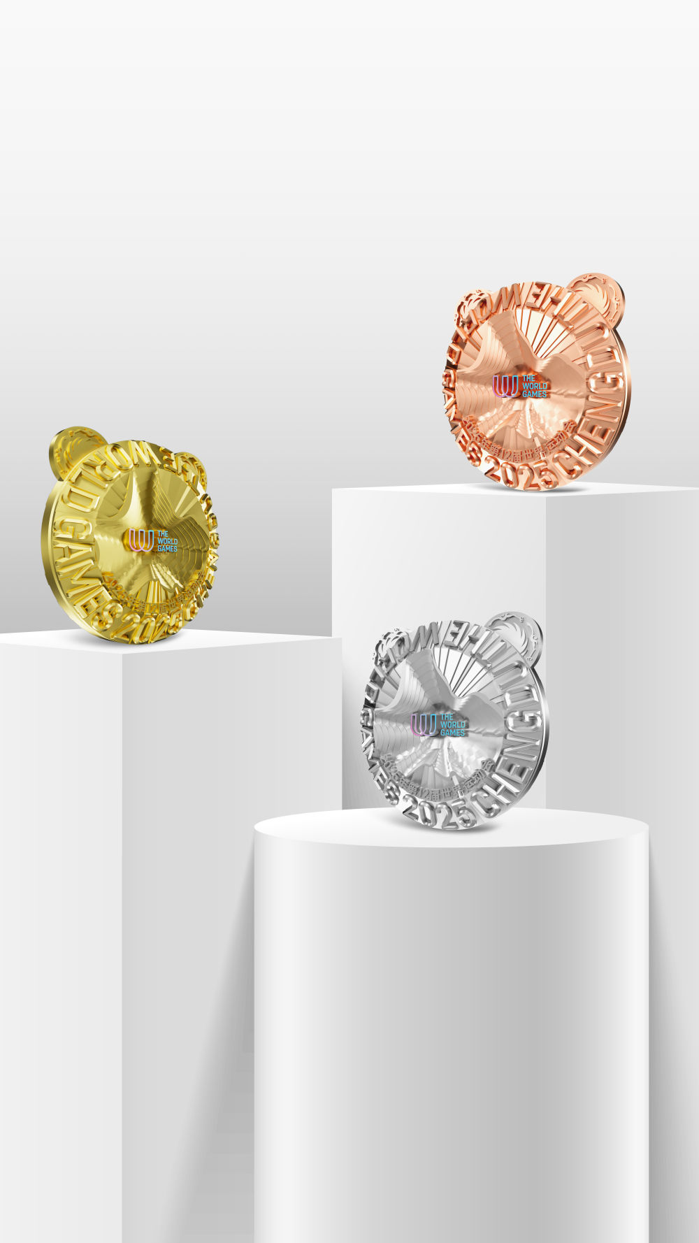 “竹光”奖牌正面居中的是国际世界运动会协会会徽,赛事中英文名称环绕呼应。巧妙融入的太阳神鸟纹饰,与暗合城市轮廓的流动凹凸线条,在底部营造出层层光芒,既彰显中华文明、巴蜀文化的璀璨历史,更象征着运动精神永恒闪耀。