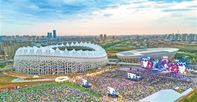 安徽省芜湖市峨山镇的繁昌人民体育公园内,人们在观看音乐节表演。
